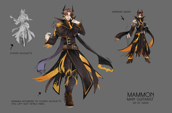 マモンは最も基本的な罪の強欲を体現する悪魔です。 彼は常に自分の富 を誇示してます。マモンが使用しているギターも、すべて豪華にカスタマイズされています。 マモンはバンドの会計係であり。しかし、マモンの行動が他のバンドバーを傷つけるとしても、主に彼の欲望と利益に基づいています。